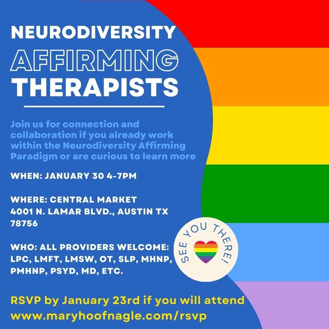 I am hosting Neurodiversity Affirming providers events for Austin area NDA therapists can connect and collaborate, and therapists curious about the NDA paradigm can connect and learn. If you are NDA, or want to learn more about NDA practice, please connect with us!